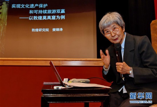 面對約200名臺灣民眾,81歲的“敦煌女兒”樊錦詩在分享敦煌研究院成立75年來的發展歷程和成果時,提到最多的詞是“守護”與“平衡”。